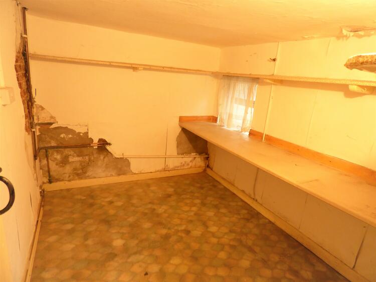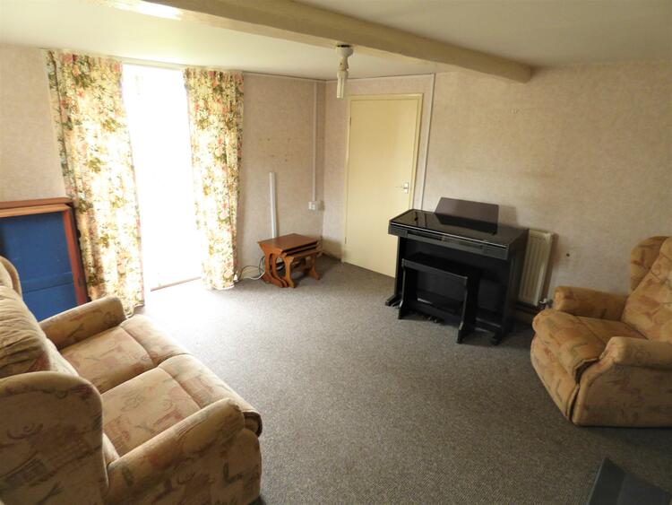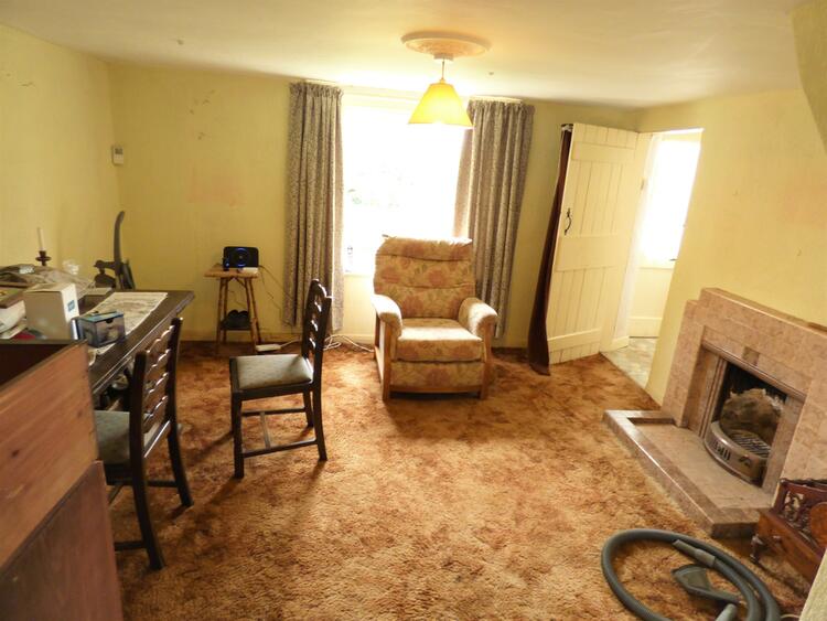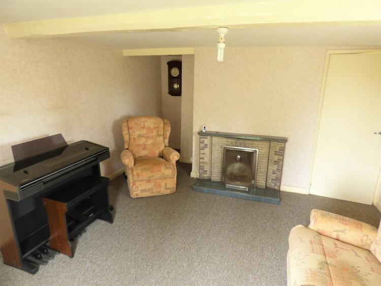 With gas fire and back central heating boiler, built-in alcove cupboard, stainless steel sink and drainer, stairs to first floor, electric meter and consumer unit cupboard.