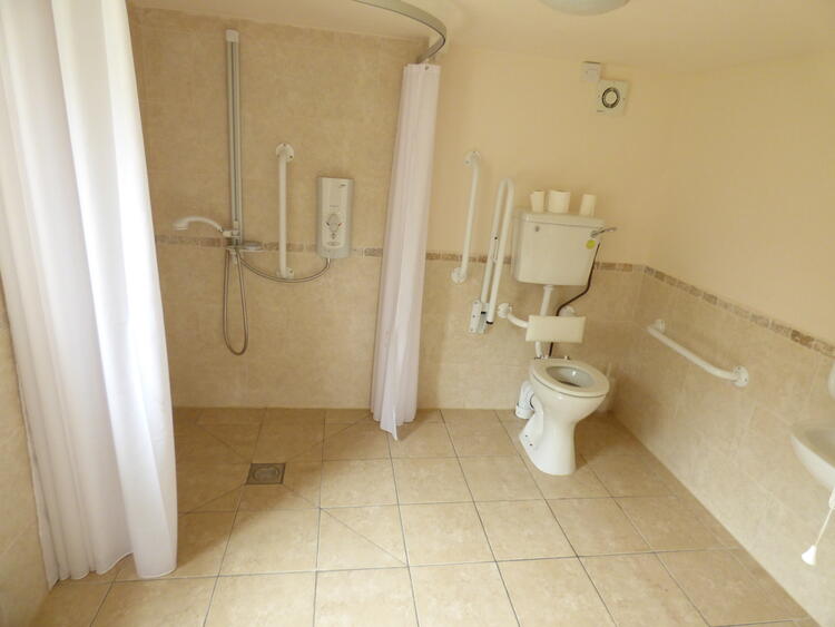 With part tiled walls, Mira shower, w/c., washbasin, tiled floor, radiator, extractor fan.