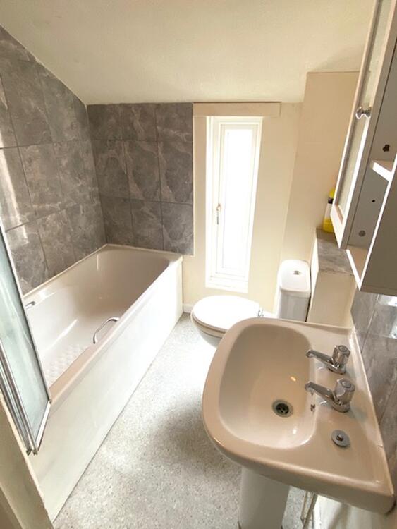 Fitted with a white three piece suite comprising a panelled bath with shower attachment over and folding shower screen, pedestal wash hand basin and wc. Ceramic splashback tiling, storage cupboard and double glazed window to front elevation.