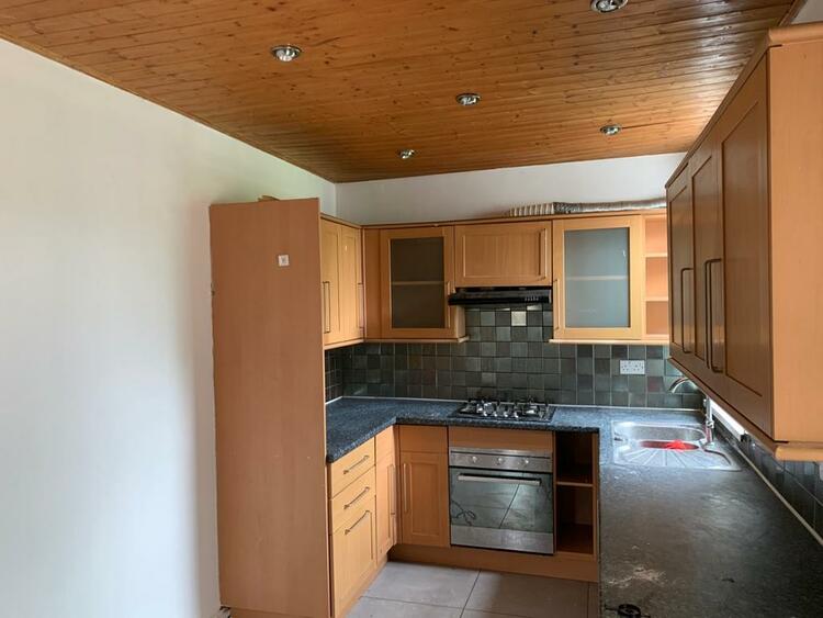 A spacious kitchen with a range of fitted wall and base units. Stainless steel sink. Built in oven and hob (not tested).
