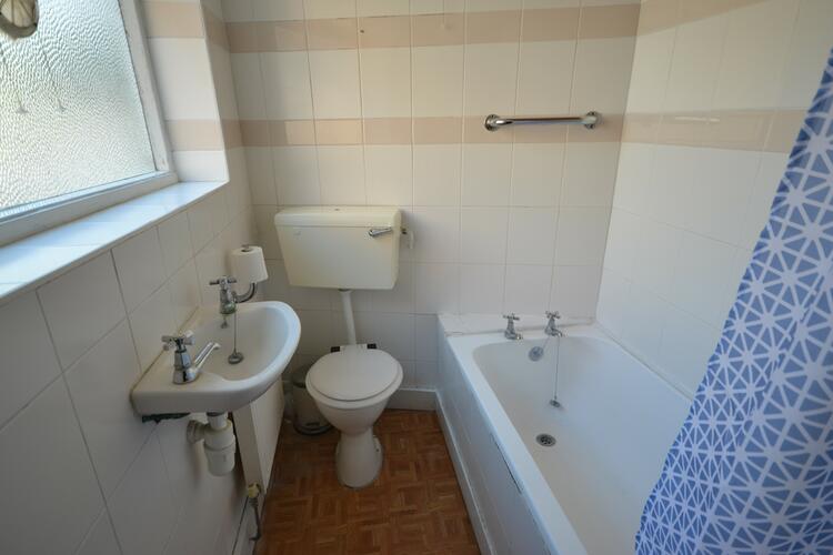 Modern white suite comprising panelled bath with boiler fed shower over, wash hand basin and low level wc, radiator and opaque window to side elevation.