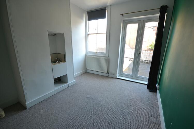 Wash hand basin fitted to recess, radiator and French doors to rear elevation.