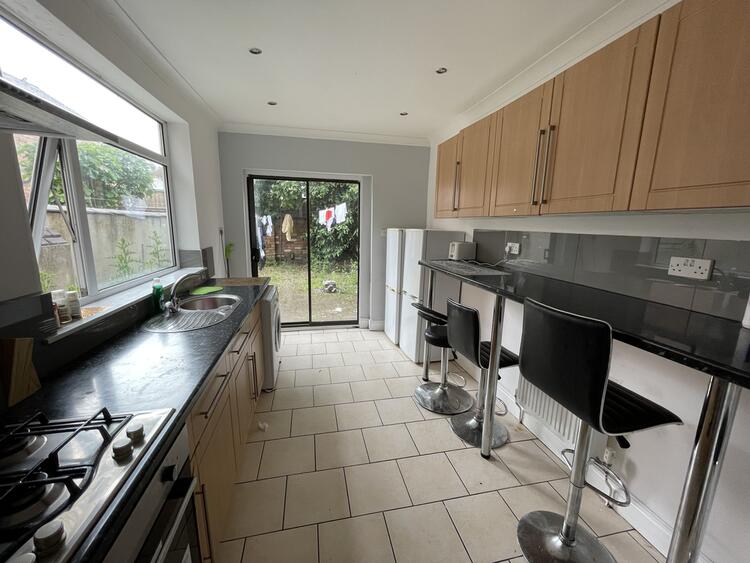 Ceramic tiled flooring, gas cooker, stainless steel sink basin, breakfast bar, radiator, sliding door to rear