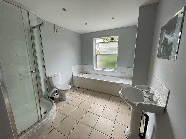 Ceramic tiled floor, shower cubicle with mains mixer shower, bath unit, WC, hand basin, window to rear