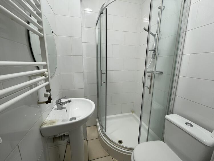 Ceramic tiled flooring, shower cubicle with mains mixer shower, WC, hand basin, heated towel rail