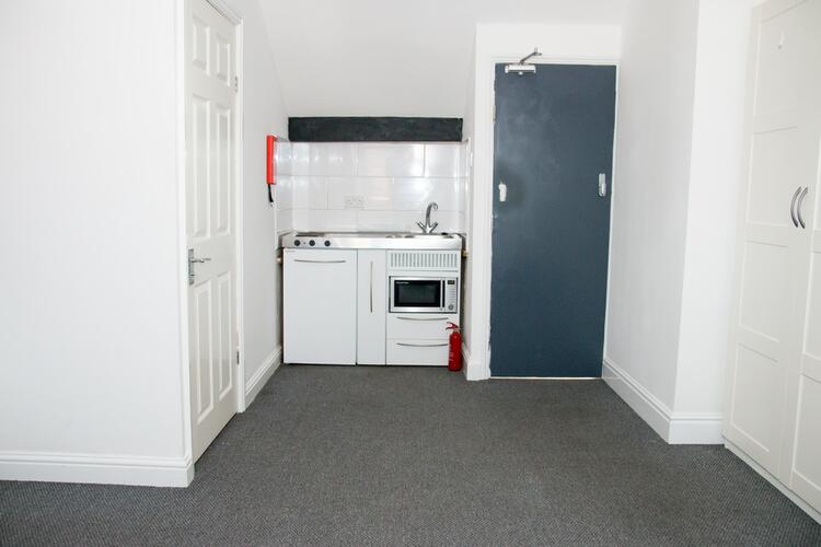 Carpeted, kitchenette with electric hob, stainless steel sink and built in microwave, radiator, window to front
