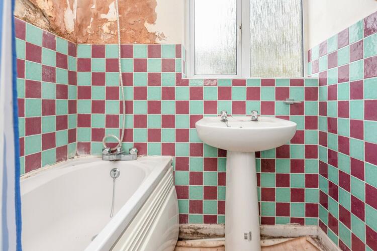 Opaque double glazed window to the rear aspect, pedestal wash hand basin, panelled bath with shower attachment and tiled splash backs and radiator.