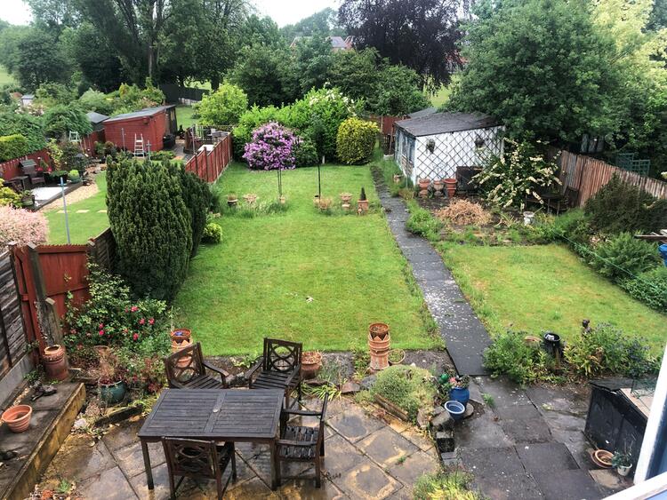 Lawned garden to the front with driveway. A substantial rear garden with outside toilet. Lawns, patio, two stores/shed and the garden backs onto Clarendon Park.