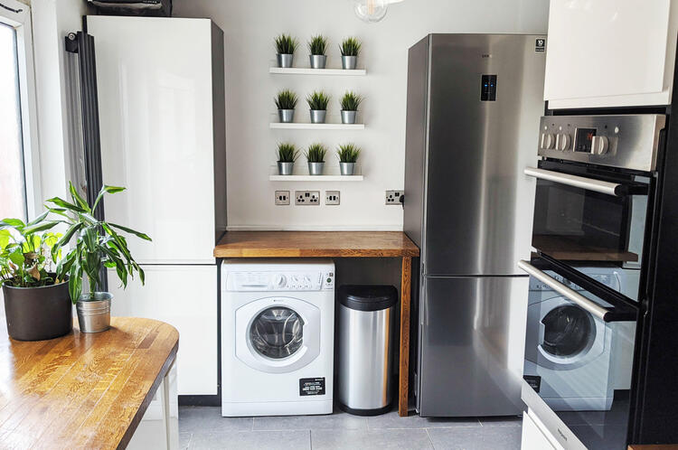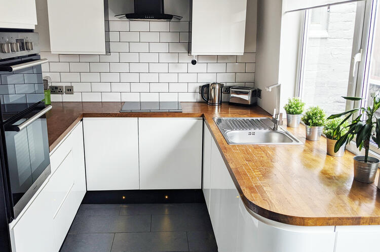 Fitted with contemporary style white high gloss units with wall mounted cupboards, matching base units, wood U-shaped preparation surface with sink and drainer. Integrated appliances comprise a double oven with separate electric hob and chimney style fan assisted illuminated cooker hood over. There is also an integrated dishwasher, slate effect tiled floor covering and enclosed wall mounted Worcester combination boiler.