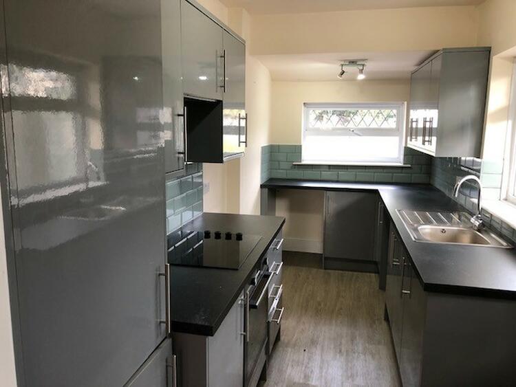 A range of modern base and wall units. Work surfaces with inset sink, integrated oven, hob and extractor. Window to the rear and side and door to the side lobby.