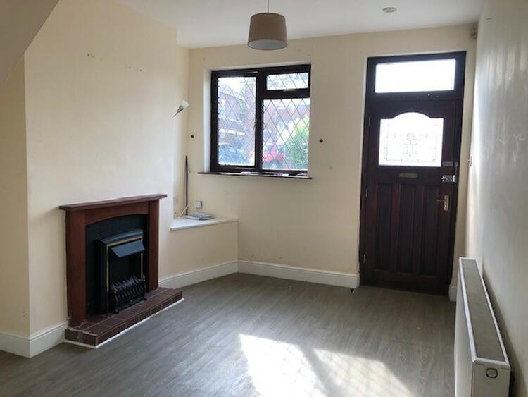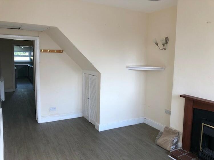 WIth fireplace, understairs cupboard and window to the front.
