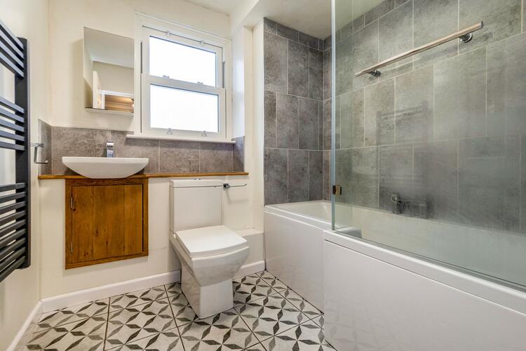Double glazed sash window to rear aspect, panelled bath with electric shower over, low level WC, hand basin with vanity unit under, heated towel rail, part tiled walls, tiled floor.