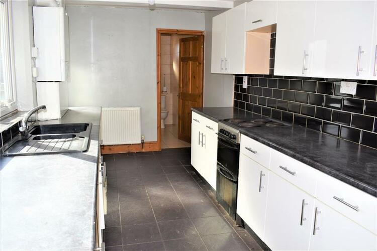 Appointed with a range of white high gloss finished high and low units with granite style tops to include inset 1 1/2 bowl resin sink unit with cupboards under, space and plumbing for an automatic washing machine, 6 base units, under counter spaces for refrigerator and separate freezer, electric cooker recess, a further 5 units at eye level, wall mounted gas fired combination boiler, tiled splash areas, Pvcu double glazed window and door to the side aspect, radiator and slate style tiled floor