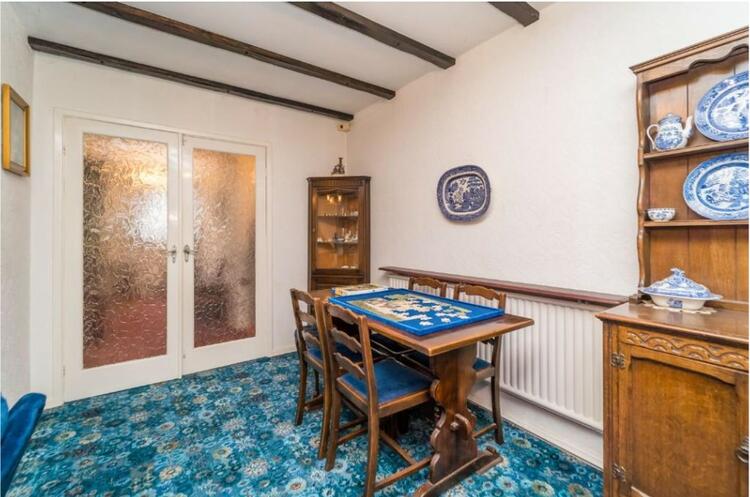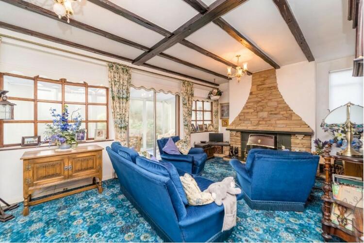 Large windows and patio doors to the rear elevation which leads to a conservatory, fire surround with brick fireplace, radiator, ceiling with wooden beams and light fittings.