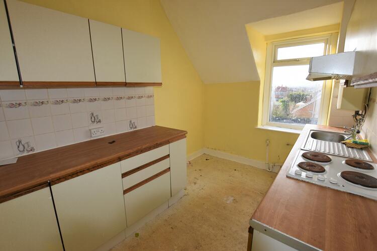 This one bedroomed top floor flat is in need of some upgrading. It enjoys sea views from the lounge and benefits from electric storage heating an uPVC double glazing.