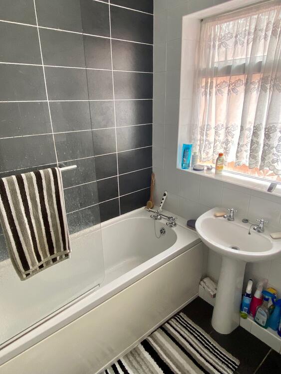 Panelled bath, low flush WC, wash hand basin and window to the side elevation