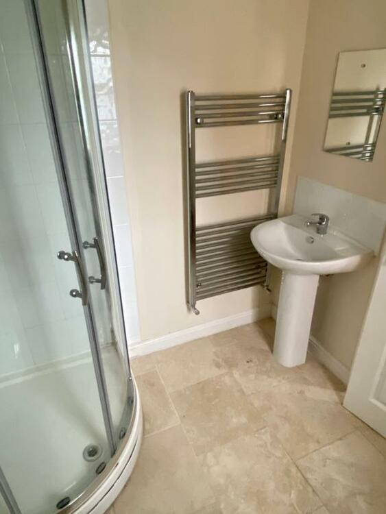 Double glazed window to the front, corner shower, W.C., wash hand basin with mixer tap, heated towel rail, tiled flooring and tiled splash backs.