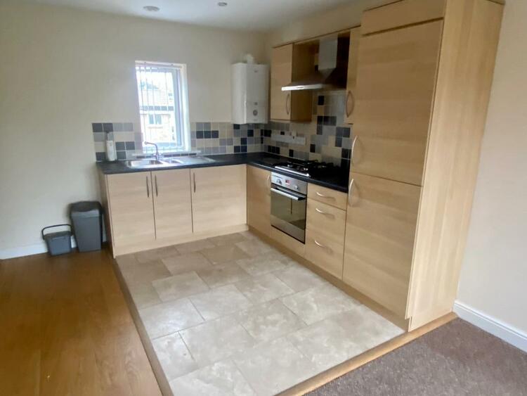 Double glazed windows to the front and rear, wall and base units with roll edge work surface over, inset sink and drainer with mixer tap, integrated fridge/freezer, washer, dryer, oven with hob and extractor fan above, tiled surrounds, boiler and a radiator.