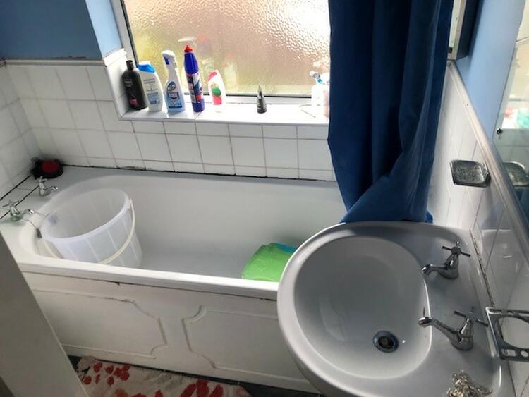 Having a white suite comprising low flush w.c. wash hand basin and panel bath with electric shower over. Radiator and window to the rear.