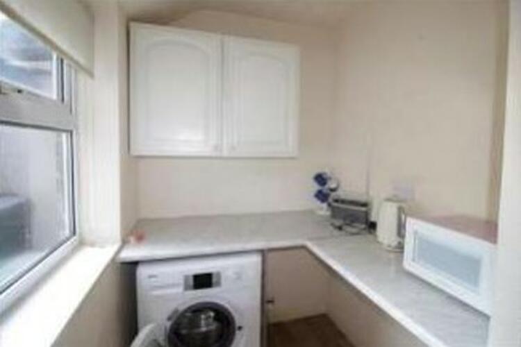 having wall units, preparation surfaces, plumbing for washing machine and UPVC double glazed window to the rear elevation.