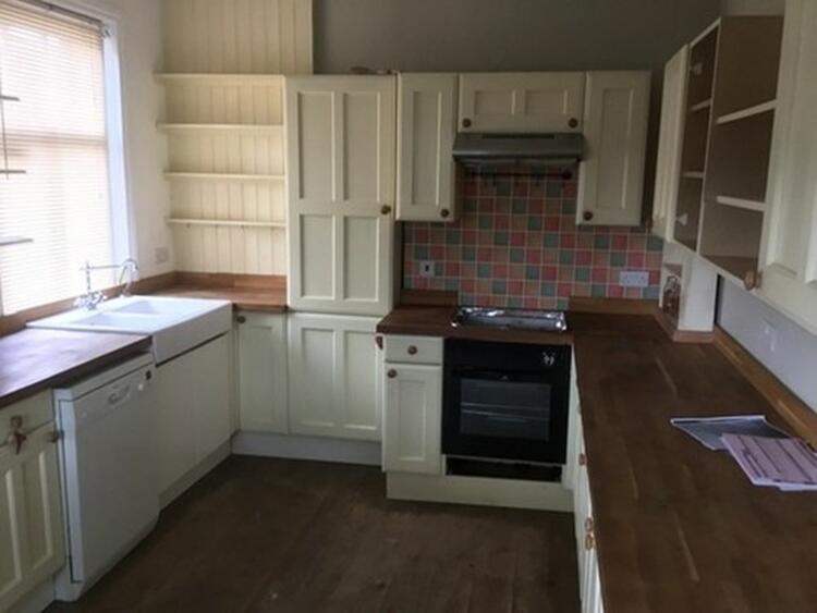 A fitted kitchen with a range of wall and base units, work surfaces and a sink/drainer unit. Having a gas oven, plumbing for a washing machine, a rear facing window and door leading to the rear garden.