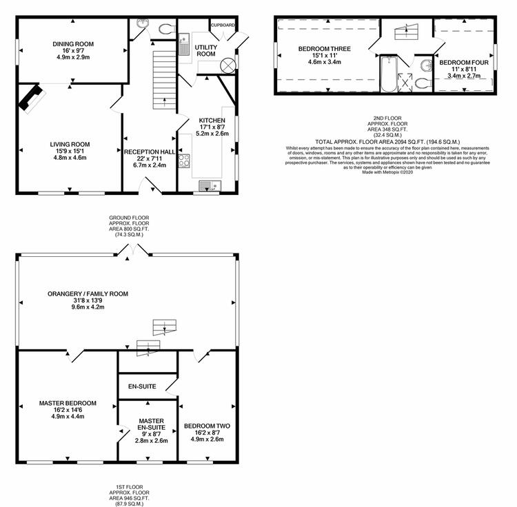includes the free standing appliances namely the fitted oven & hob, fridge freezer, dishwasher, washing machine and tumble drier which are located in the equally spacious utility room to the rear. To the first floor is the orangery, a great family/entertaining space measuring over 29ft in width. This room too has a log burner. To the front, both double bedrooms on this level are en-suite, the master bedroom having a fully fitted range of wardrobing and a good sized bathroom to include corner jacuzzi bath with spa shower &