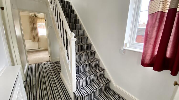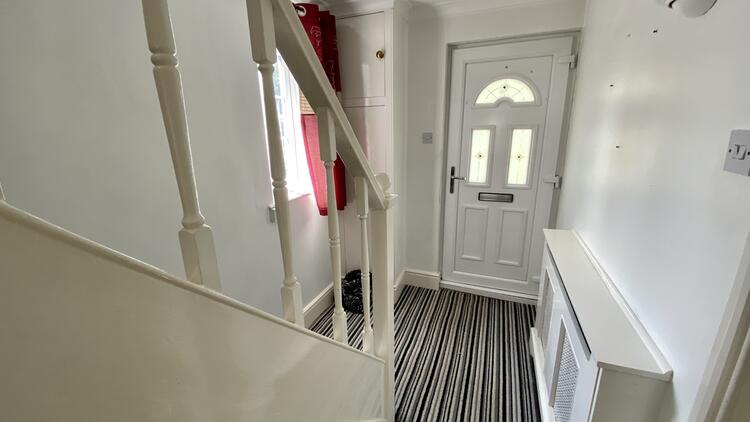 having upvc double glazed front door, built in meter cupboard and balustraded staircase.