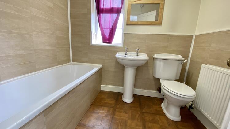 having white suite including panelled bath with shower over, low level w.c., pedestal wash hand basin, central heating radiator, vinyl flooring, panelled and ceramic tiled splashbacks.