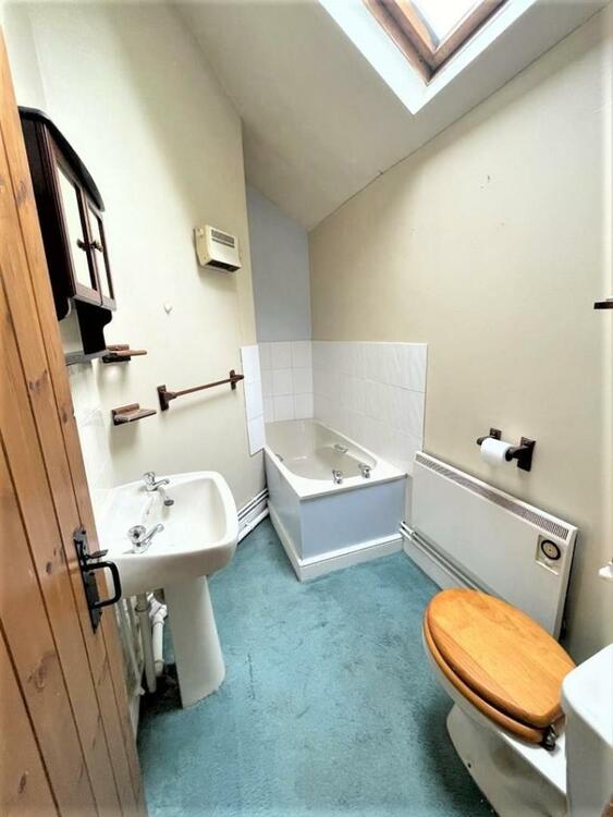 With a white three piece suite comprising low flush wc, wash hand basin and panelled bath. Part tiled walls, electric radiator and Velux window.