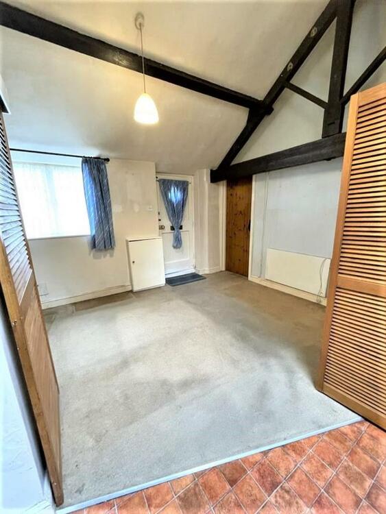 With a range of kitchen units, sink, worktops and appliance space. Cathedral type ceiling with exposed beams and Velux window. Lounge Area with electric radiator and further window to the front aspect.