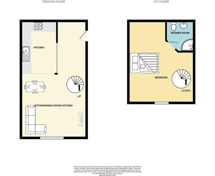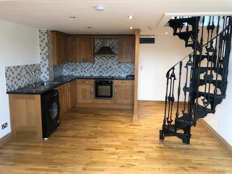 Open plan living with a fitted kitchen with base and wall units, sink, oven, hob and extractor, built in fridge and washing machine. Lounge area with wooden flooring, electric heater and window. Spiral stairs lead to bedroom and shower room.