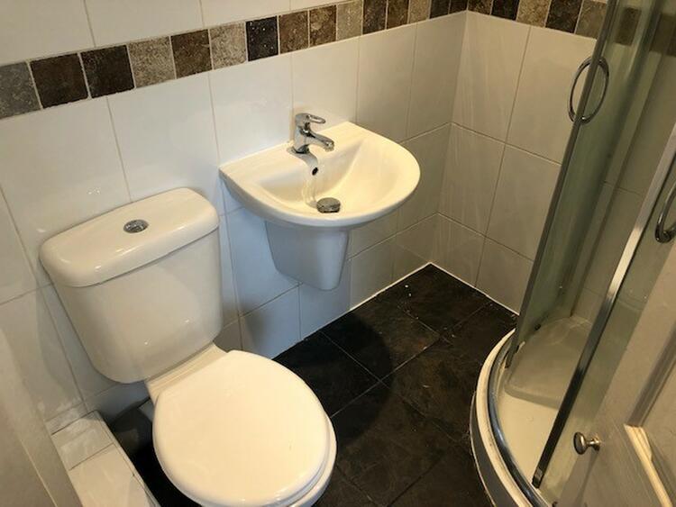 With modern suite comprising low flush w.c. wash hand basin and shower cubicle. Tiled walls and flooring.