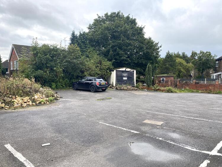 To the rear there is a large car park with a dilapidated garage.