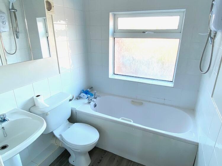 With uPVC double glazed window to the rear elevation. A three piece bathroom suite in white comprises a panelled bath with Triton shower unit over and shower rail, low level wc, pedestal wash hand basin, tiling to walls, wall mounted glass mirrored cupboards, extractor fan and central heating radiator.