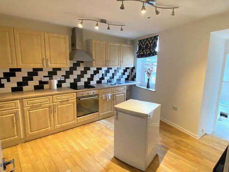 (Please note this is an irregular shaped room). Fitted in oak units comprising wall mounted cupboard with matching base units, preparation surface with sink and drainer, mixer tap, PVC door to the side and access through to the shower room.