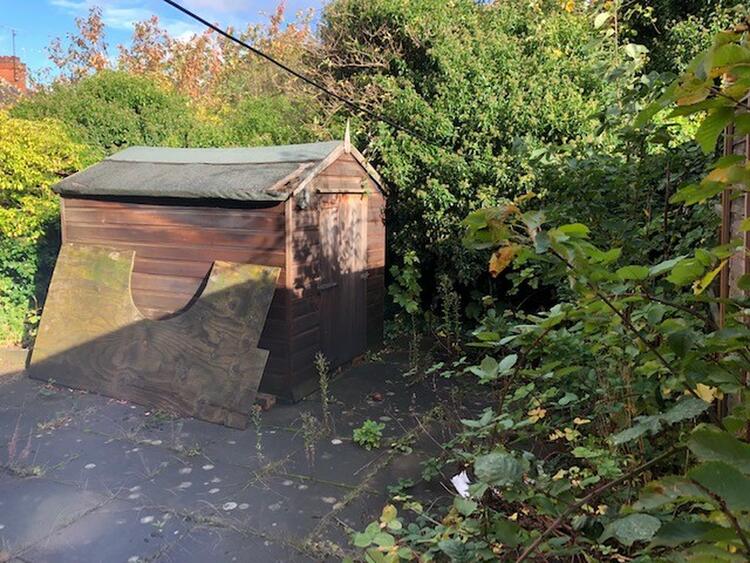 Fore-garden with stocked flower beds. Side paved courtyard with gated access and enclosed rear garden with timber shed.