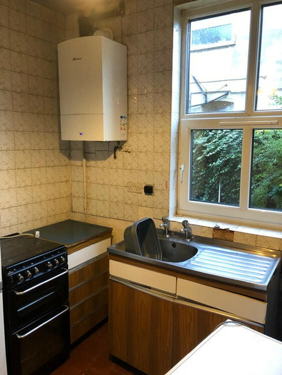 With double glazed window. The fitted kitchen comprises cupboards, preparation surface, stainless steel sink and drainer, splashback tiling, cooker point, plumbing for washing machine, wall mounted Worcester combination boiler and central heating radiator.