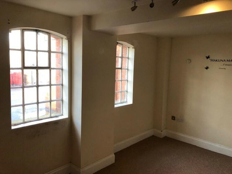 A spacious room with electric radiator and two arched windows to the side aspect.