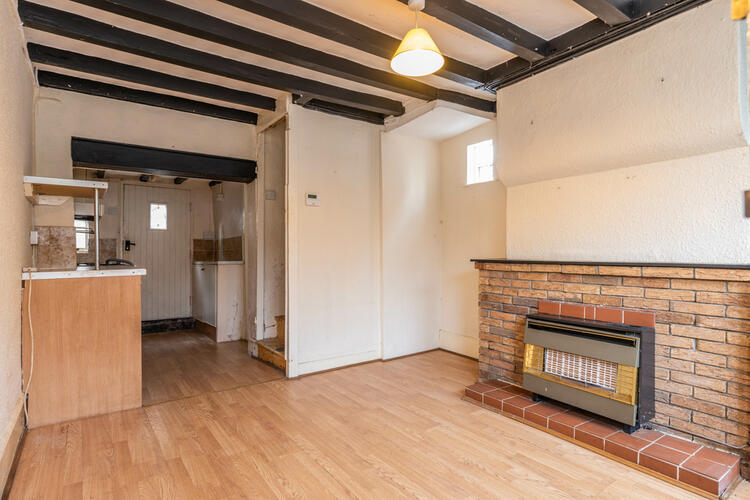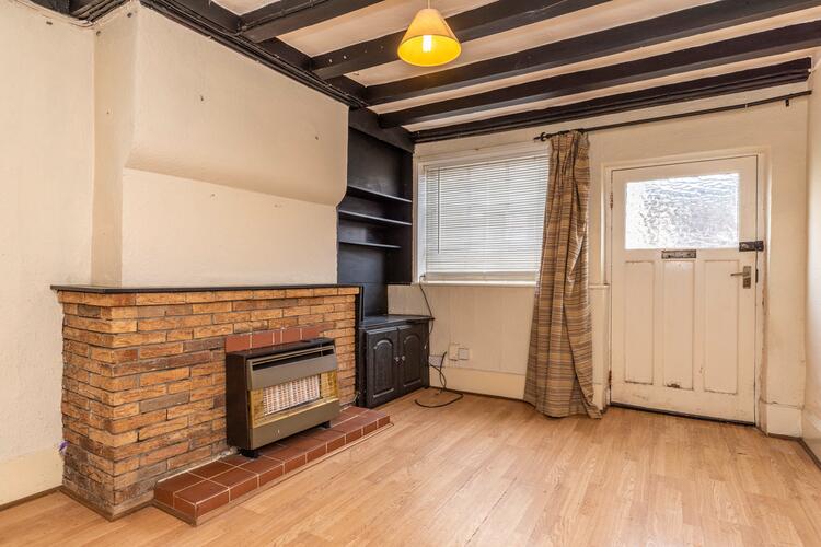 With gas fire, beamed ceiling and both window and door to the front aspect.