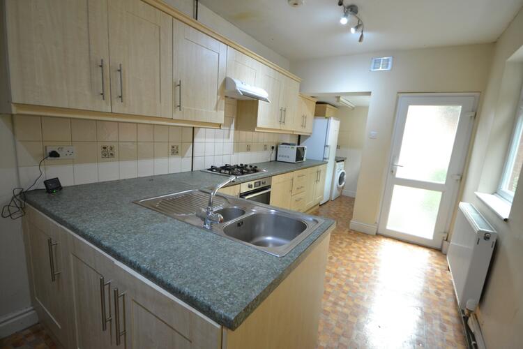 With a range of base and wall units, appliance space, sink, worktops, oven, hob and extractor. Radiator, tiled floor window to the side and door to rear garden