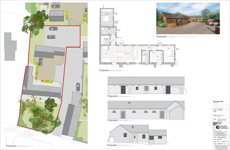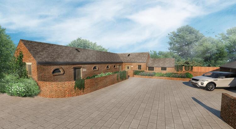The approved scheme incorporates an L-shaped detached three bedroomed barn with associated garaging, outbuildings and sizeable gardens.