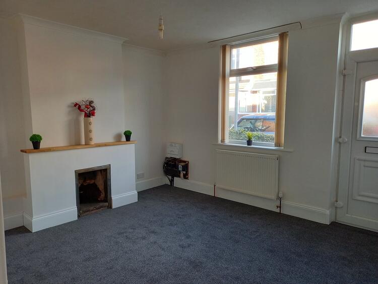 A white uPVC door opens onto the lounge, matched by a white uPVC double glazed window to the front. Feature fire place, power points, a ceiling light and a radiator.