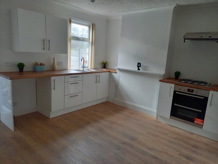 A white uPVC double glazed window looking out onto the rear garden. Brand new fitted modern kitchen comprising of wall and base units, integrated double electric oven, gas hob with extractor over, space for under counter fridge/freezer, 1.5 stainless steel sink and drainer. Laminated flooring.