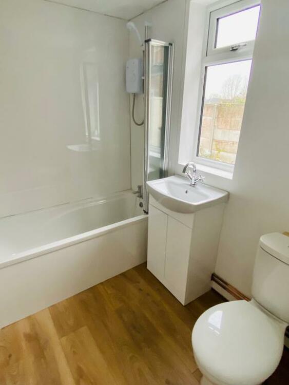 Brand new white three piece suite comprising of panelled bath with electric shower over, low level wc, vanity unit with hand-wash basin, wall mounted chrome towel rail. A white uPVC double glazed window to the side elevation.