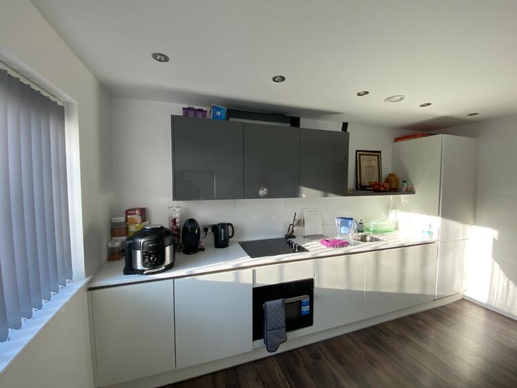 * High gloss fitted kitchen with composite worktop.