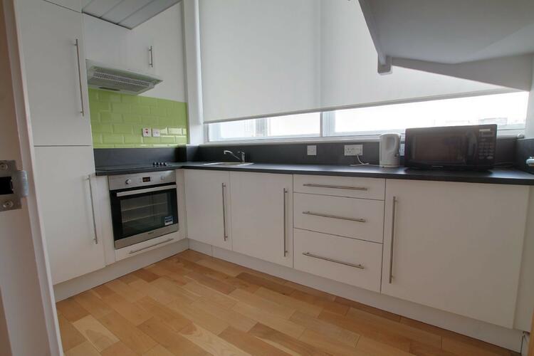 Comprising: sink, wall and base units with storage drawers and granite style worktops, integrated appliances comprising: halogen hob with filter hood over and electric oven, fridge, freezer and washing machine, oak wooden floor, radiator.