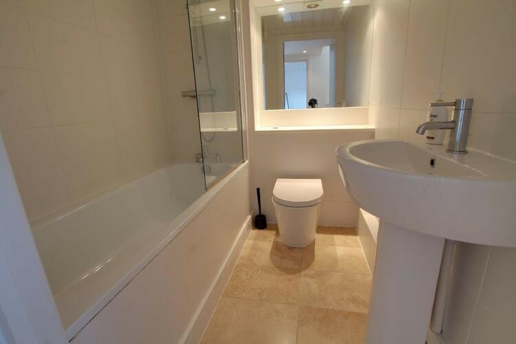This stylishly appointed bathroom comprises: wash hand basin with mixer tap, concealed low-level WC, panel bath with mixer tap and chrome mixer shower over with glass shower screen, wall mounted mirror with decorative downlighters, tiled floor, tiled walls.