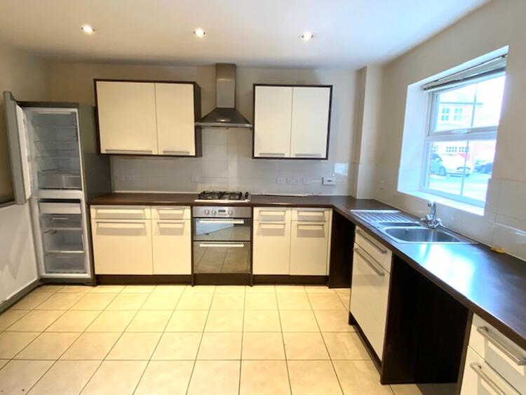 With uPVC double glazed window to the front elevation. The fitted kitchen comprises a range of wall mounted cupboards with matching base units, U-shaped preparation surface with stainless steel sink and drainer and splashback tiling. There is a built in oven, gas hob with cooker hood over, space for fridge freezer, plumbing for washing machine and central heating radiator.