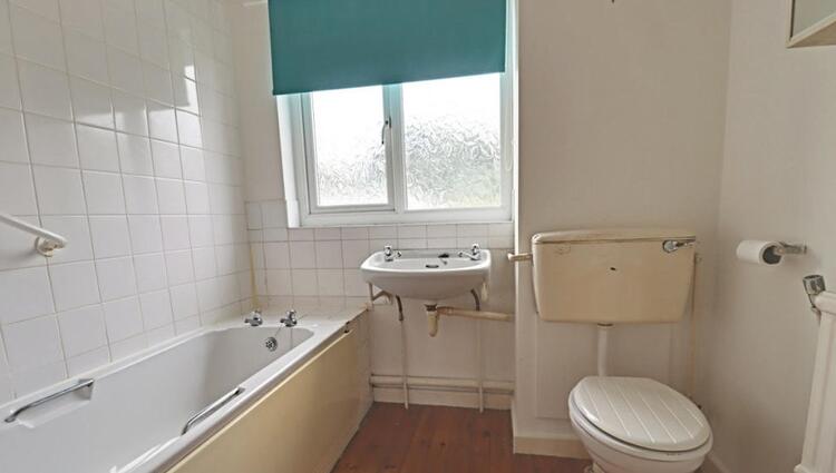 Having opaque uPVC double glazed window to the rear, low level flush wc, pedestal wash basin and bath with electric shower over.