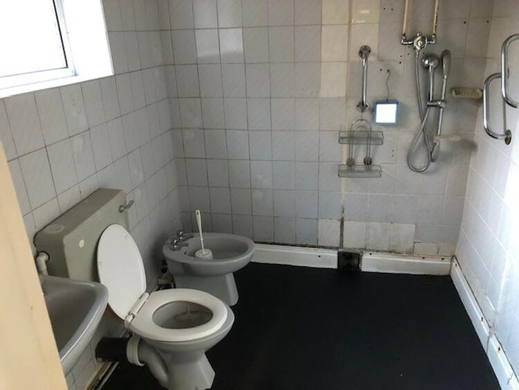 With low flush wc, wash hand basin and shower area. Radiator and window to the side.